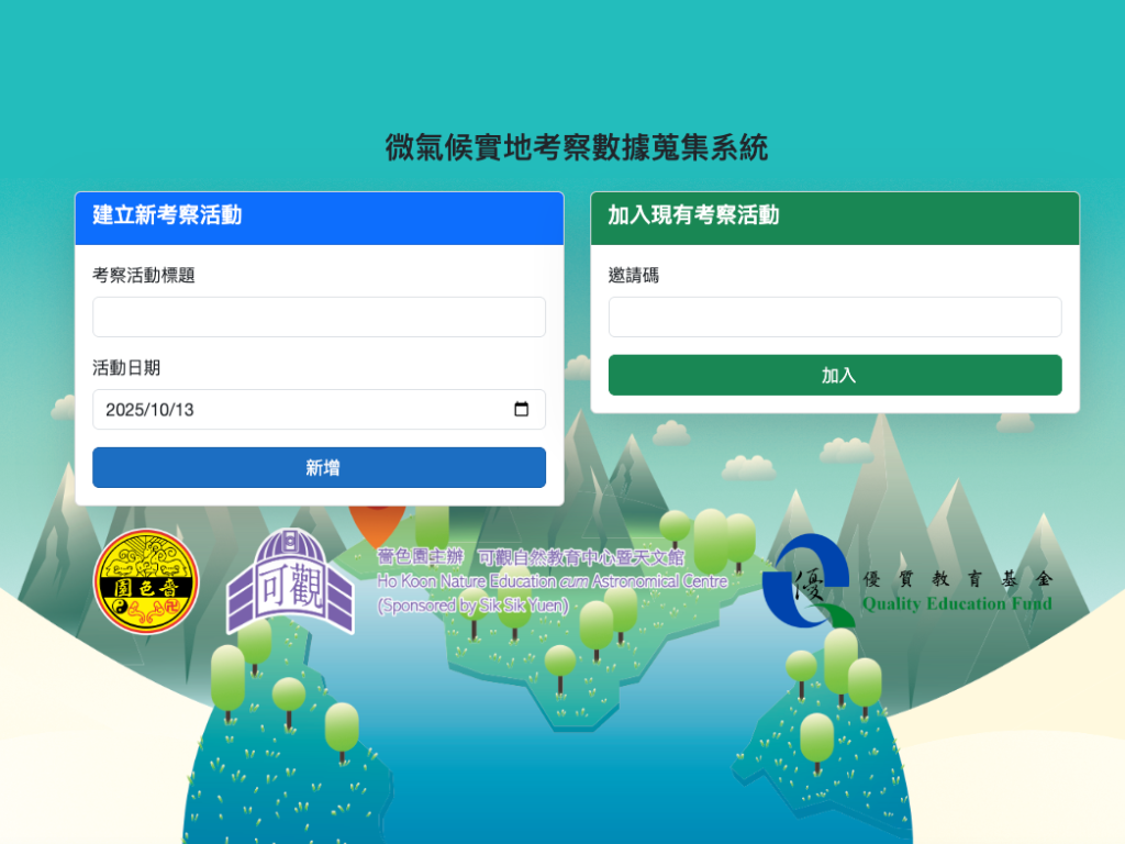 微氣候實地考察數據蒐集系統 「天氣數據蒐集及分析」親身蒐集天氣數據 此部份為地理探究式地理考察工具,協助學生親身蒐集天氣數據,管理所蒐集的一手資料,及進行相關的數據處理和圖表分析。學生能以個人方式進行探究,於同一地點不同時間蒐集天氣數據,或以小組形式於同一時間不同地點蒐集天氣數據。所上傳的數據及相關圖表可以不同檔案類形輸出,讓學生更深入探討微氣候或天氣變化等議題。 將於12月發布。